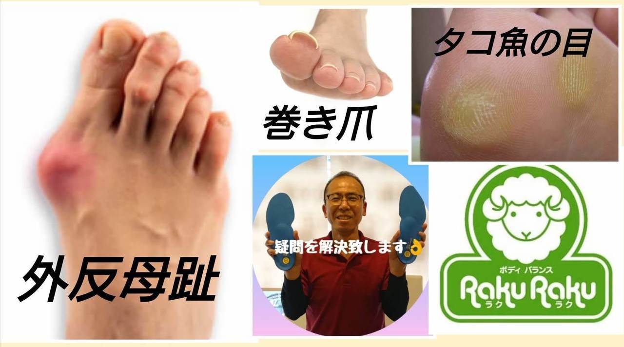 外反母趾・巻き爪・タコ魚の目・靴が合わないなどで足のトラブルで、腰痛・肩こり・頭痛・むくみ・冷え症など体のトラブルを招きます。足のトラブルでお悩みの方は、ボディ・バランスRAKURAKUまでお気軽にご相談ください。